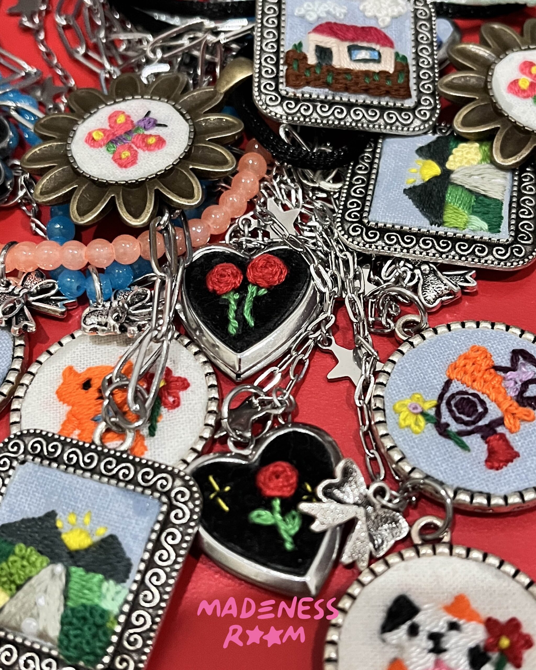 The vary style of making art whether it’s digital illustration or handmade art piece is the reason why she called it Madeness. In a room full of creativity flowing, inspired by daily consumption on the internet of silly animals, fashion outfit even poetic lyrics by making it sketches and into stitch.
